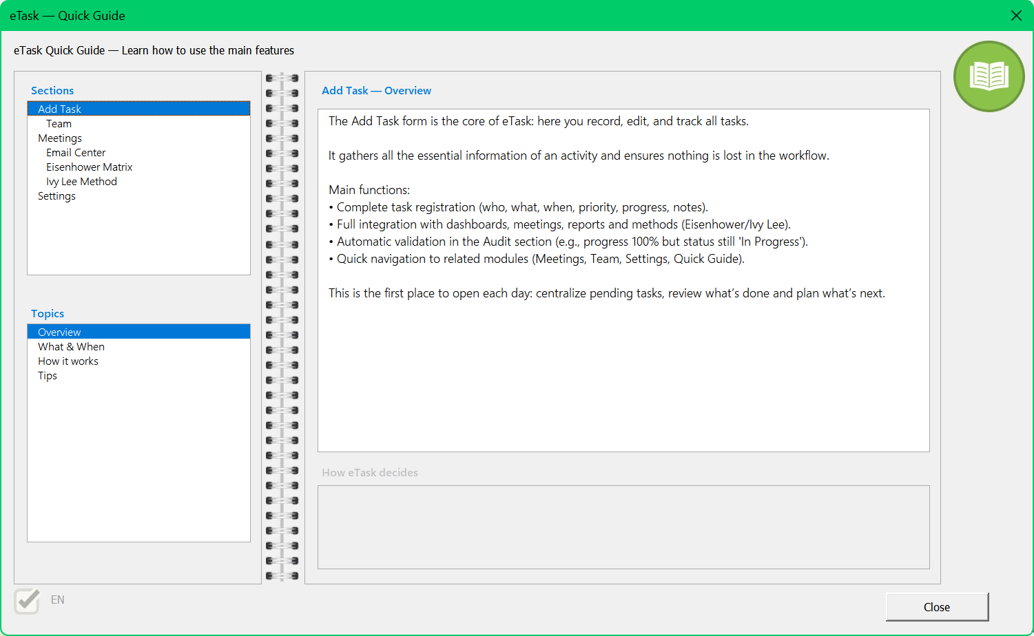 The eTask โ Full Edition is a complete Excel-based productivity system that helps professionals, teams, and managers organize, track, and automate their daily activities โ all within Microsoft Excel.